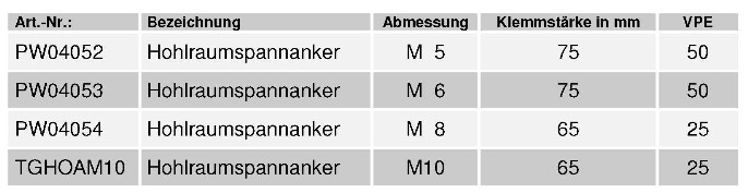 Ungewöhnlich wenige Montagehandgriffe, einfach verblüffend. Man kann eine Ankerbefestigung im Hohlraum nicht schneller und sicherer herstellen! Keine Vorauswahl nach Klemmstärken von verschiedenen Dübeln für unterschiedlich dicke Platten. Nur Auswahl M 5 - M 6 - M 8 oder M 10.